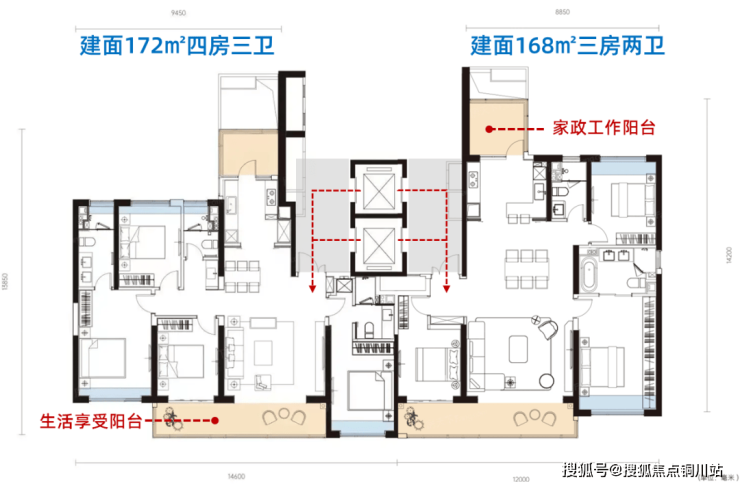 目前1号楼即将售罄,以主要在售的2号楼168㎡、172㎡户型为例。