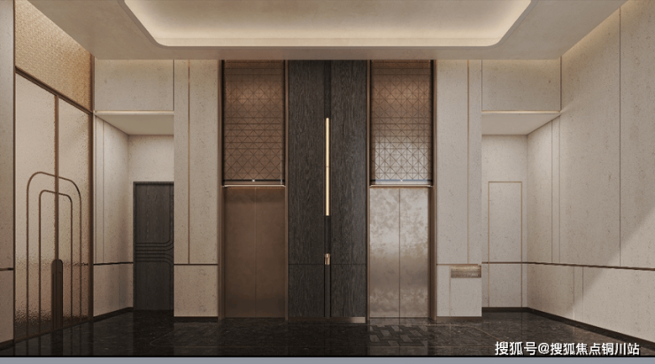 首先看玄关,为了回应其对归家私密和外玄关收纳的诉求,采用双侧开门贯通电梯,实际使用效果为两梯一户,同层业主入户动线互不打扰,让每位业主独享约17㎡电梯前室。