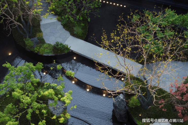 一脉活水溪涧,将宋式园林 “清、幽、雅” 之韵表现到极致。引自园区中央水系,水源经层层过滤后清透如镜,溪底以光面石材铺就,波纹状石坝依 “三叠” 之势错落堆叠,复刻 “藏源露脉” 的造园古法。