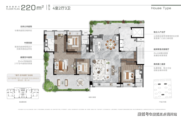 约46㎡转角庭院,实现风、光、绿植的三维共生,让平层也能拥揽星空入怀;