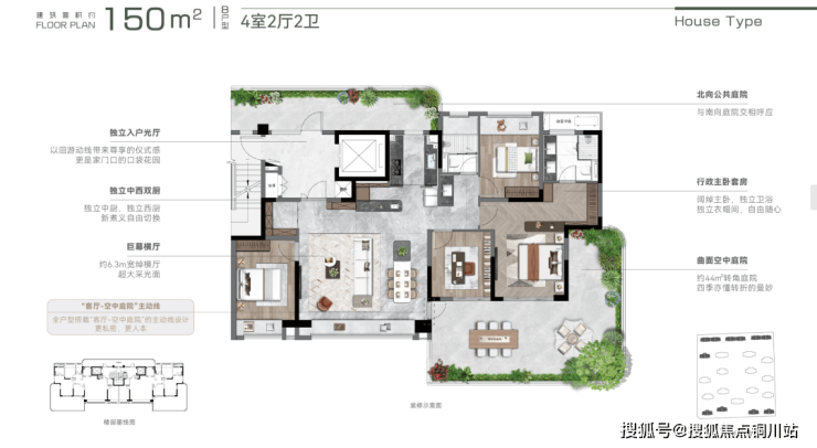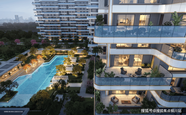 项目以曲面转角院落+南北双花园的创新设计,打造户均约30-50㎡空中庭院矩阵。