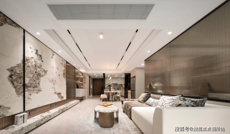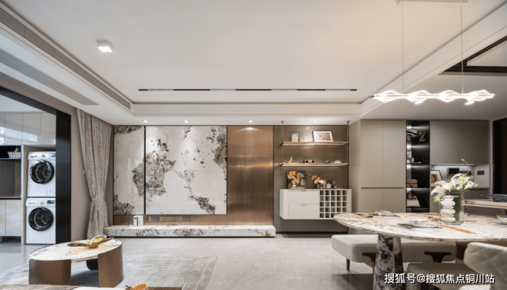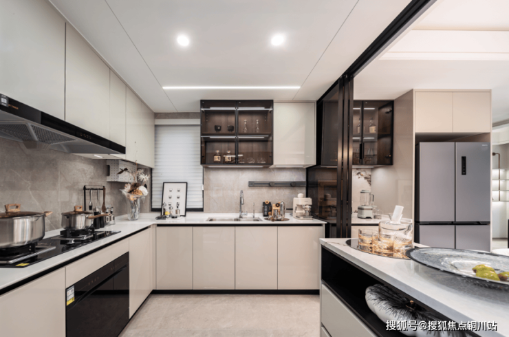 玄关柜里的挂钩;厨房内的洗碗机、末端直饮水、岛台;升级为岩板的电视背景墙;阳台近落地窗配的三玻两腔玻璃;主卧皮革硬包的床头背景墙……全是交付标准!