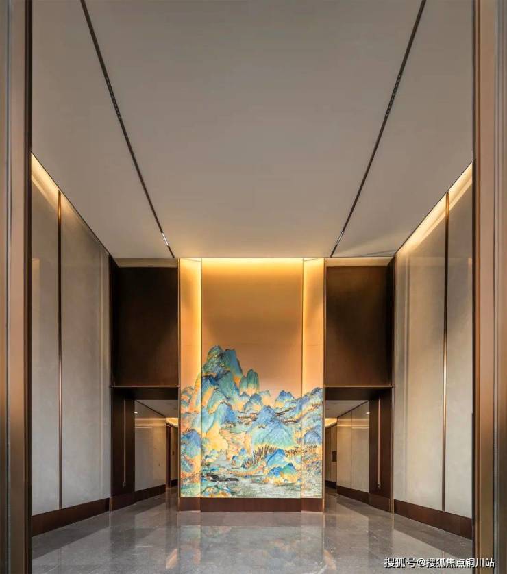 约6米高的地上入户大堂,一进门就看到巨幅珐琅幻彩玻璃屏风,灵感取自于王希孟磅礴大气的《千里江山图》,归家即享受。