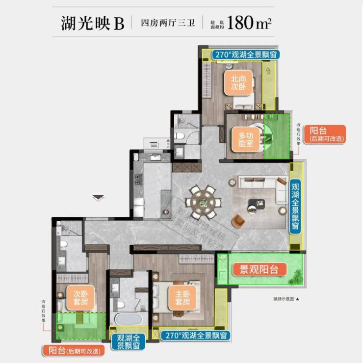 主卧、北次卧均设计270°转角全景飘窗,餐客厅由东侧飘窗+南向观景阳台形成270°广角视野,揽一线自然湖光入怀