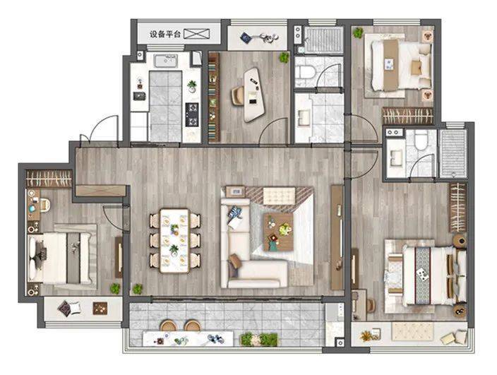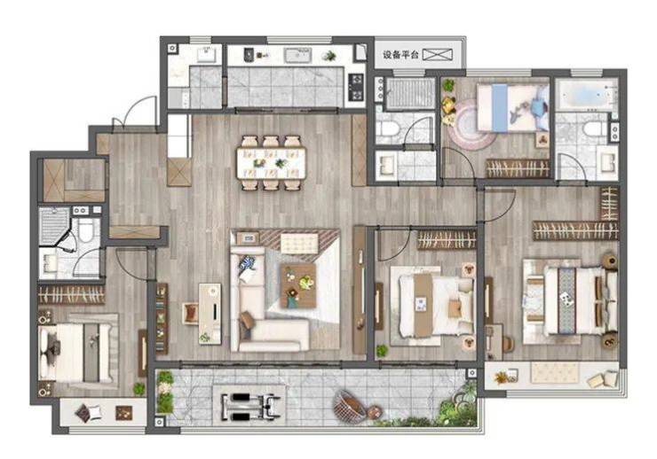 最后是建面约168㎡的大平层户型,配置了四房两厅三卫,单从数据上来看,堪称深改、终极改善一族的优选!