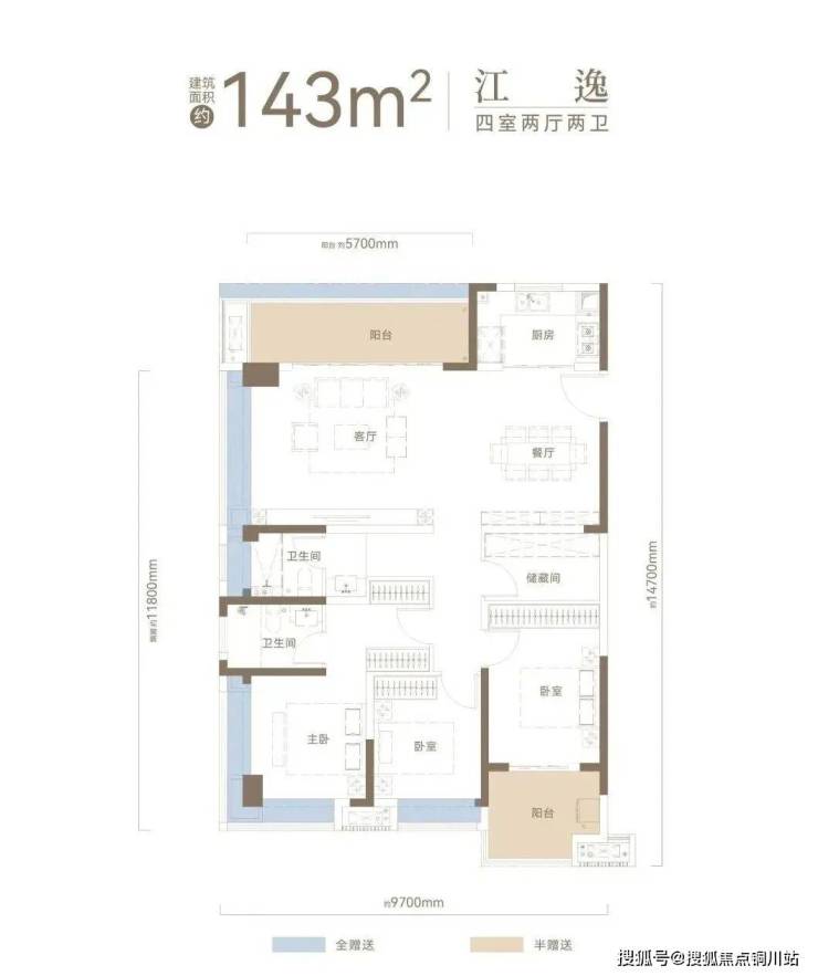 143㎡:270°瞰江,超27m的观江视野,3+1房的设计、LDKB一体化端厅,得房率高达95%,完爆传统170+㎡。