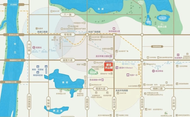 地理位置:项目坐落于武汉东湖高新区,具体位于南湖大道与民族大道交汇处,地处光谷核心区域,周边产业聚集,人才流动频繁,生活氛围浓厚 。
