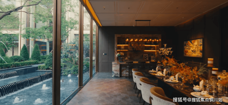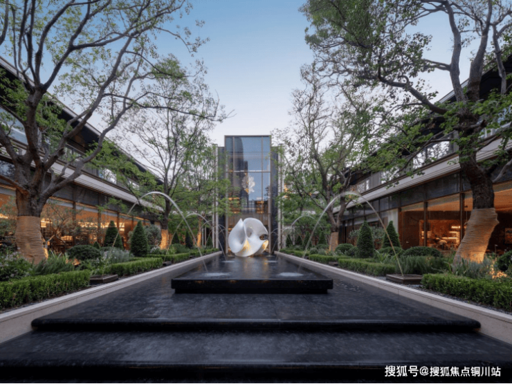 "一轴五园、一栋一花园"的生态画卷徐徐展开。中庭园林以西班牙故宫“阿尔罕布拉宫”为灵感,列阵跳泉与幻影蓝水台,以富有节奏的水景序列营造出仪式感;乌桕、油橄榄等全冠名木错落,四季成景,让每一次归家都宛如步入静谧与诗意交织的度假奢境。
