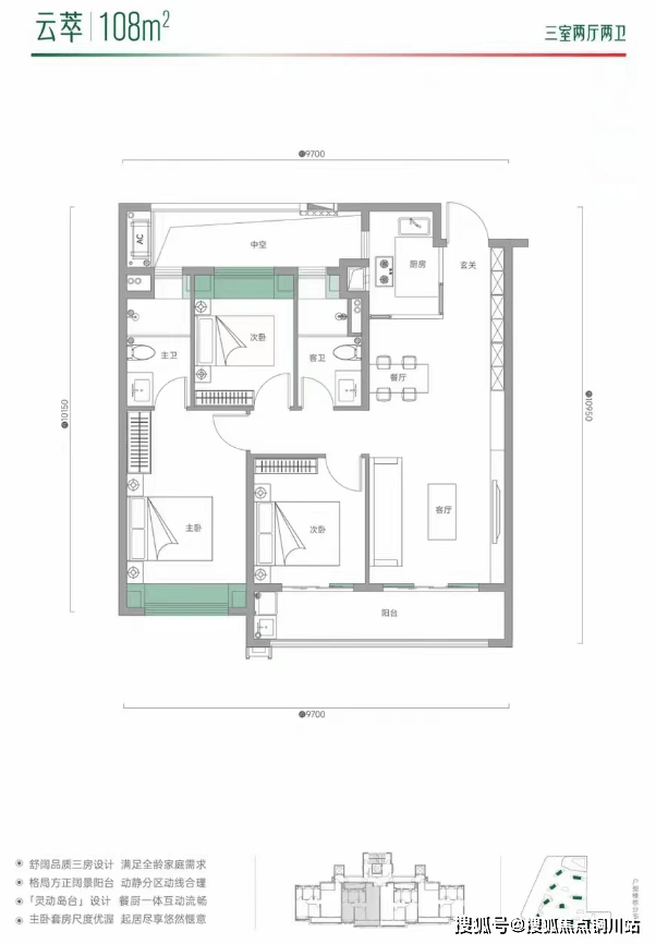 根据户型分布平面图来看,该户型所在楼栋为3梯4户格局,双连廊设计,该户型位于楼栋边户,南北通透,三开间朝南,南向有连接次卧和客厅的大阳台;户型比较方正且动静分区较好,但是过道有点浪费面积,另外根据户型图显示,该户型可以做到一梯一户的居住体验。