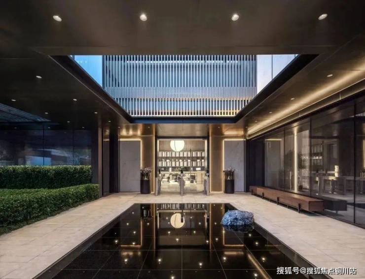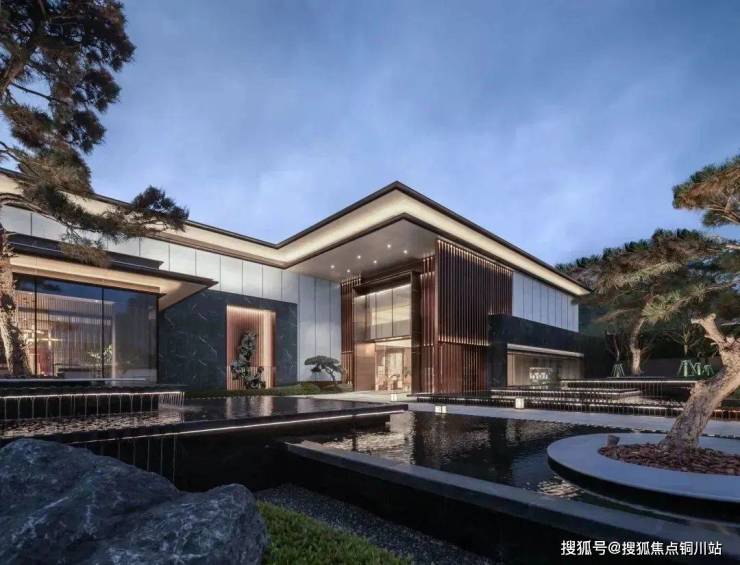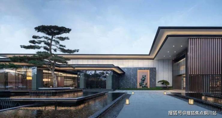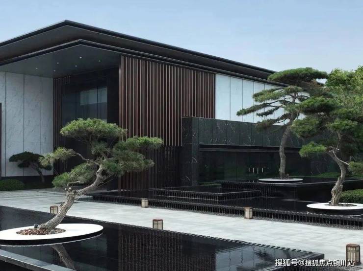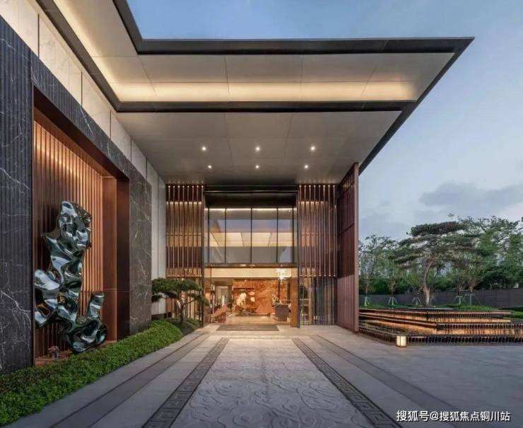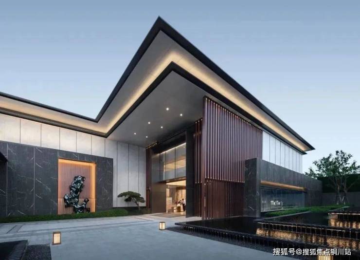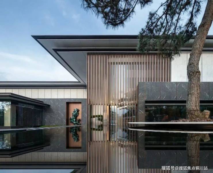 建筑立面采用富有层次感的古铜色格栅,出挑轻薄的深色屋檐,带来一种古典庄重的气势感和仪式感。