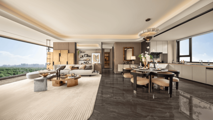 在空间营造维度,东望府展现了对塔尖人群的精准洞察。建面约158-310㎡全四房户型打破传统豪宅面积逻辑,通过3.1-3.5米层高革命、60-80㎡洄游式阔厅设计,实现从物理空间到精神场域的双重升维。