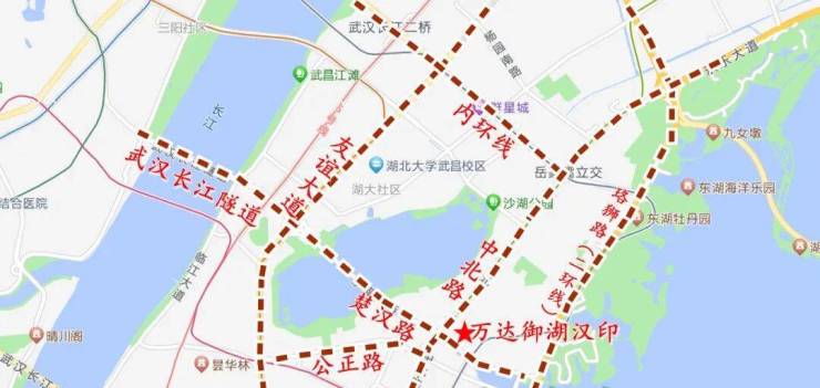万达御湖汉印位于楚汉路与中北路交汇处以东,楼市划分属于中北路板块,行政划分属于武昌区,内环线上。