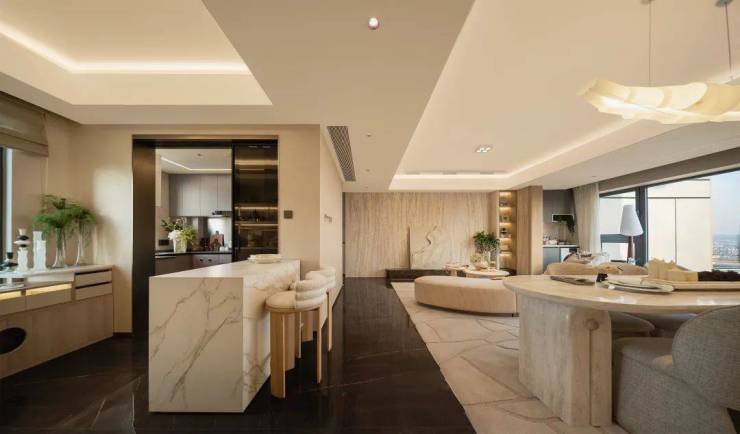 置身于样板间中,空间感比不少建面约150㎡的还要大,大横厅可以布局下大圆桌,这样原本餐厅的位置可以布置成西式岛台,对于房间需求不大的家庭,也是很好的借鉴。