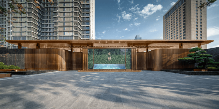 大门采用流水景墙造型,呈现出隐隐流光的玉石质地。