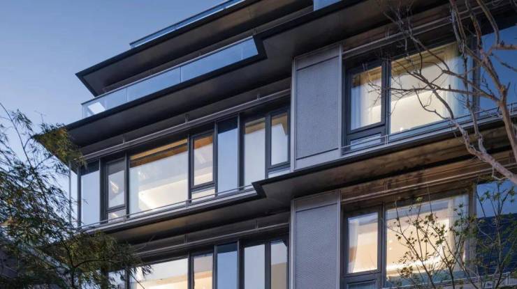 建筑风格:汲取宋式坡顶与挑檐,遵循现代高端镜面立面趋势,臻选高级铝板、石材勾勒建筑轮廓,搭配三玻两腔降噪隔音玻璃,超高窗墙比让室内与自然无界沟通。
