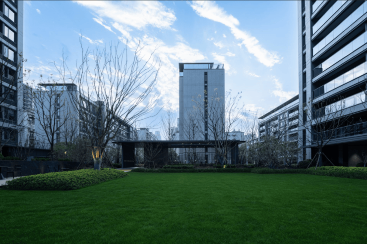 在绿植半围合的安定空间,项目设置了约800㎡的大草坪和会客厅