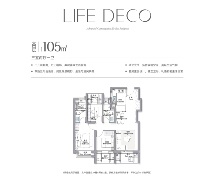 建筑面积约105㎡三房,进阶改善绝版“三阳台”户型,主力总价段约700万级,部分房源总价约650万级。