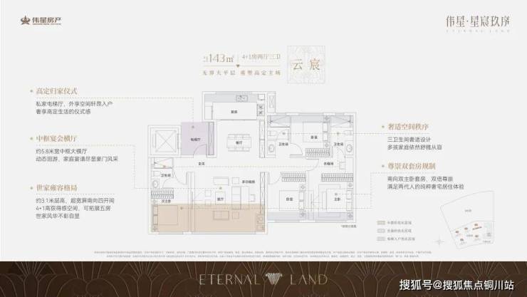 建面约143㎡的四房户型,四面朝南,采用4+1房的拓展设计,三卫和双套房,可同时满足几代人的居住。别家四房的面积段,在伟星可收获5房,怎么选一目了然。