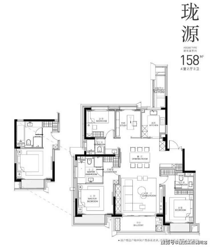 建面约158㎡户型的特点还在于可变性强,北面的房间可以灵活设计成书房、瑜伽室、茶室......让生活充满无限可能;南向次卧是配有卫生间的套房设计,可以作为长者房间使用,即使父母同住也能实现相互联系又互不干扰。