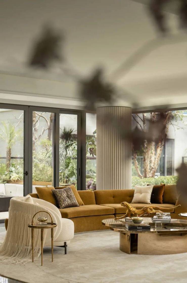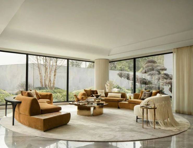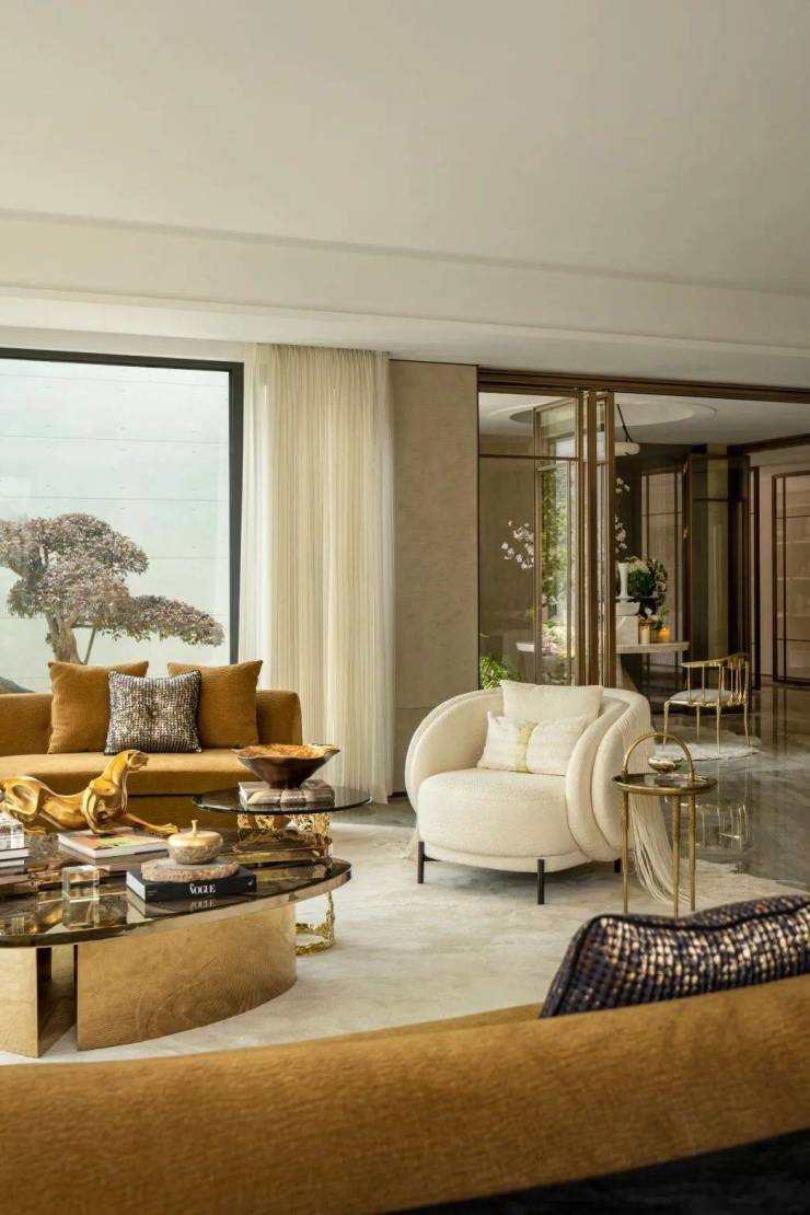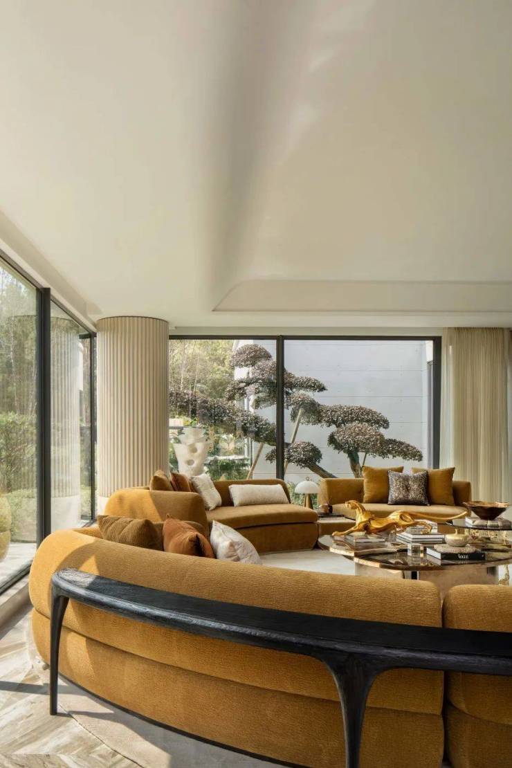 门扉轻启,“天青为韵”的序章于此铺展。客厅由简约的弧线形体引导,一方圆几搭配金属边几,沉稳内敛,静置于弧线沙发之侧,于精微处淬炼匠心。落地窗外,室内外边界在景深中弥合,每一处留白皆可探索。