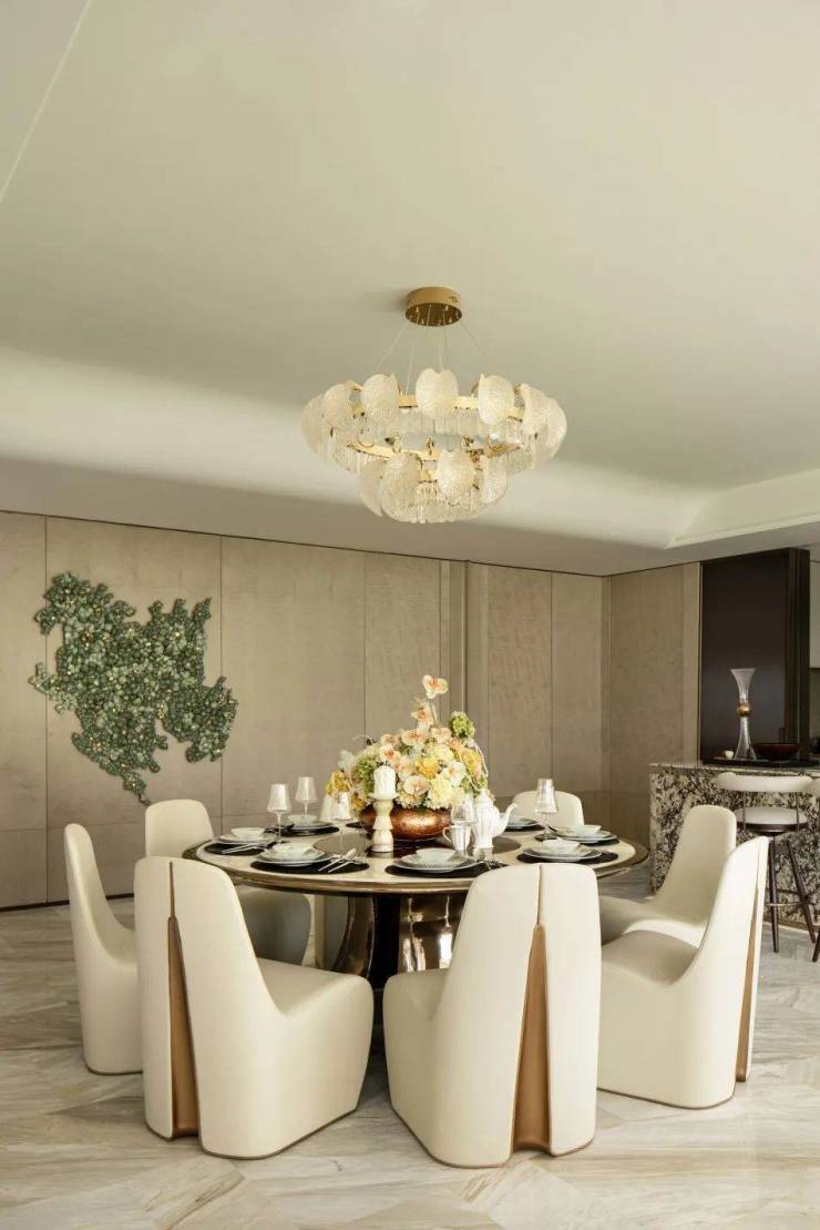 餐厨一体气韵畅达,视野所及,皆为天光与远岫铺陈的素雅长卷。餐桌如未琢之玉,环绕其侧的无扶手单椅,增加空间张力,消解了座位之间的距离感。