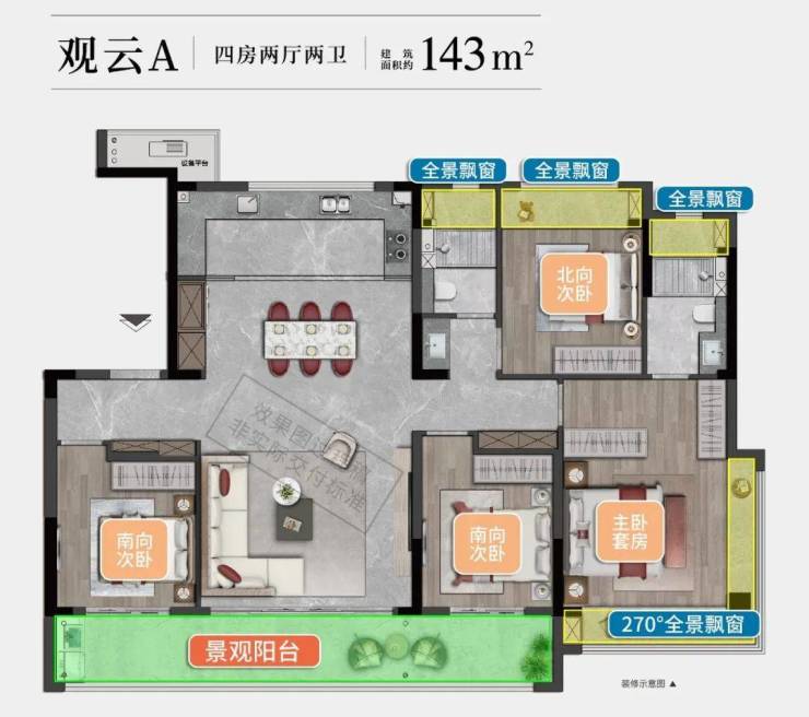 主卧、北次卧均设计270°转角全景飘窗,餐客厅由东侧飘窗+南向观景阳台形成270°广角视野,揽一线自然湖光入怀