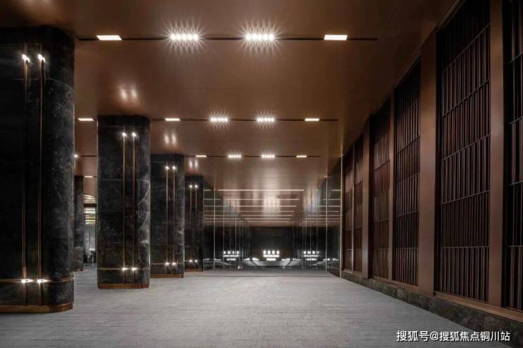 星空顶在车行途中洒下银河般的光辉,爱马仕黑石材构筑的玄关对景墙气势恢宏,水磨石地面镶嵌的金属归家标识指引方向,车马厅顶面的铝板铺装反射出高级灰的质感。