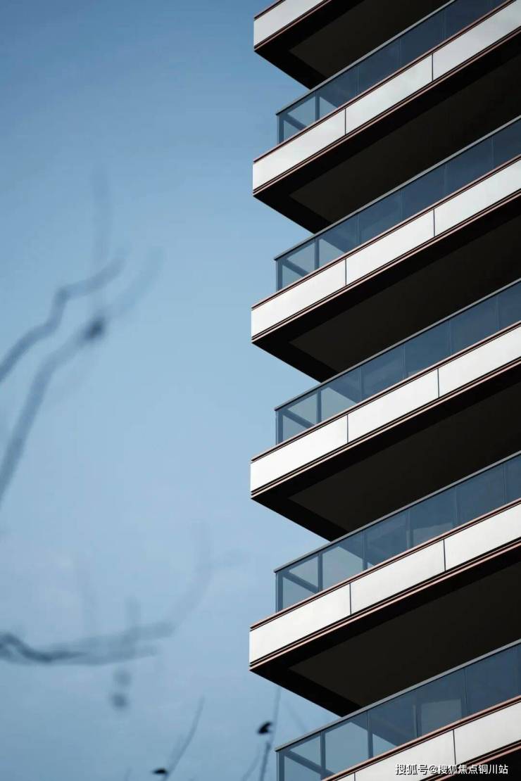 细节上,阳台采用三层暖色金属边框设计,增强立体层次感,避免传统铝板立面的单调性。