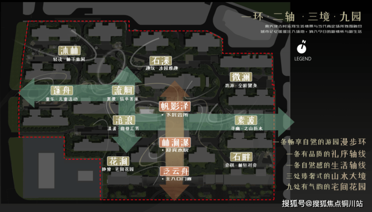 一条畅享自然的游园漫步环,一条有品质的礼序轴线,一条自然感的生活轴线,三处臻享式的山水大境,九处有气韵的宅间花园。