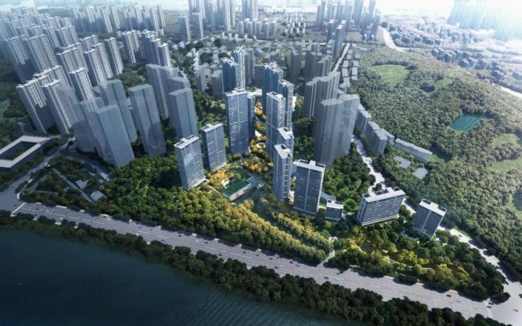 项目采用台地式布局,第一级台地相比湘江中路抬高约15米。未来远处车流人声的喧嚣都被过滤,耳畔剩下的只有鸟鸣和江水拍岸声,静谧又诗意。