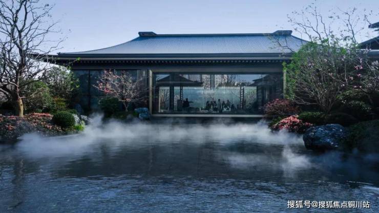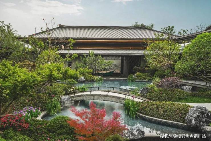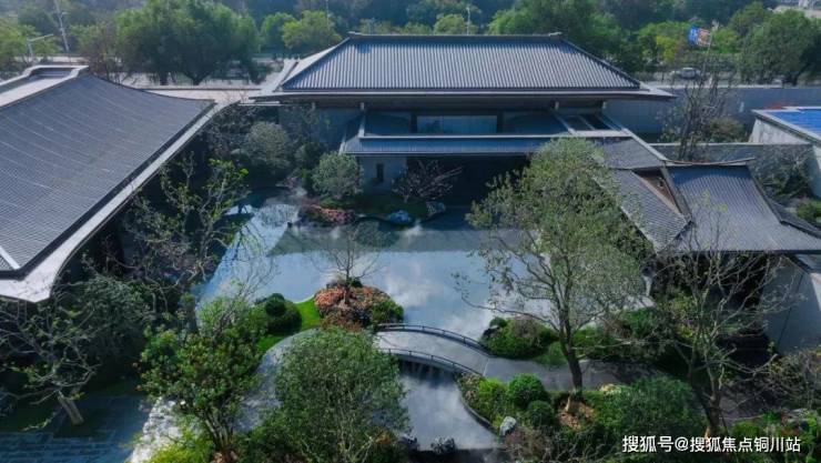 在天瑞营造的新中式园林景观中,叠山理水、瓦石铺陈、遇水搭桥、四水归堂等造景手法,将‘礼序’与‘闲适’拿捏的到位。