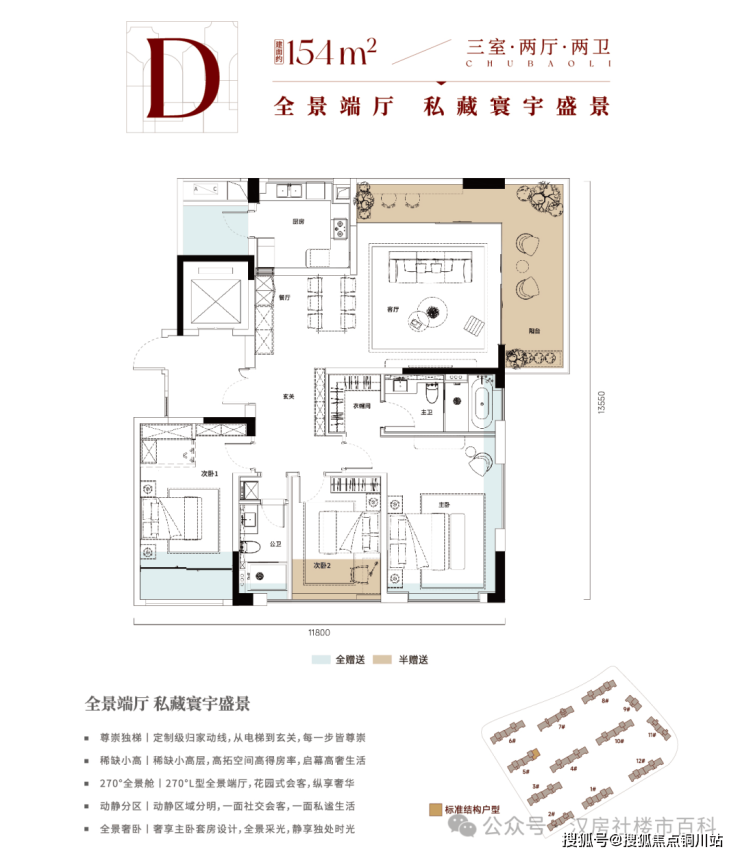 该户型位于5号楼边户,有独立的入户电梯厅,独特的 270 度转角“L”型客厅采光阳台,可以俯瞰校区内部的园林全貌,不过该户型仅有 5 号楼的边户,全小区仅 17 套。