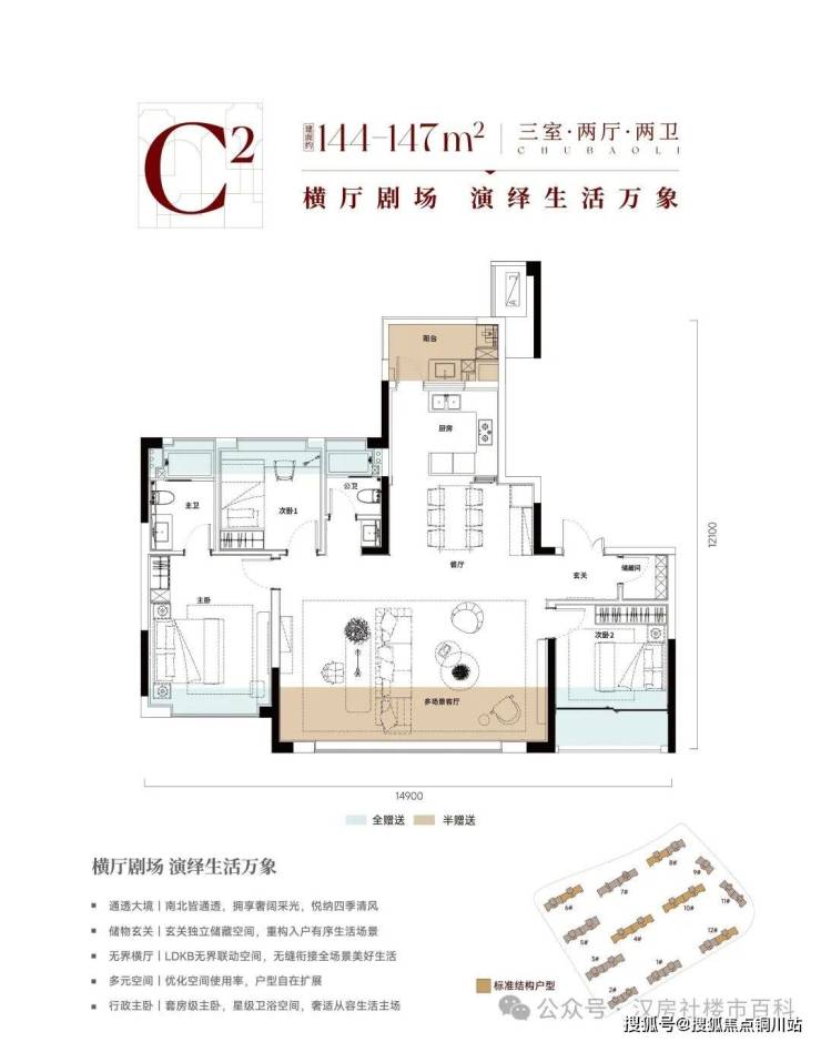 C户型丨144-147m² 三房两厅两卫