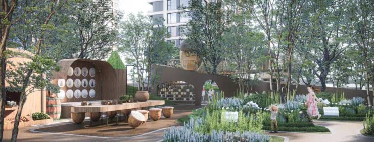 三下沉庭院设计——长沙的高端改善项目仅有极个别规划了双下沉庭院,而澜庭序项目利用台地式结构形成垂直景观生态,创新打造了三下沉庭院,融合叠水观景会客厅、松果营地主题儿童游乐场、樱花林地三大立体场景,拉升生活场景浓度,更将阳光引入整个地下室,实现了全明氧气地库的品质提升;
