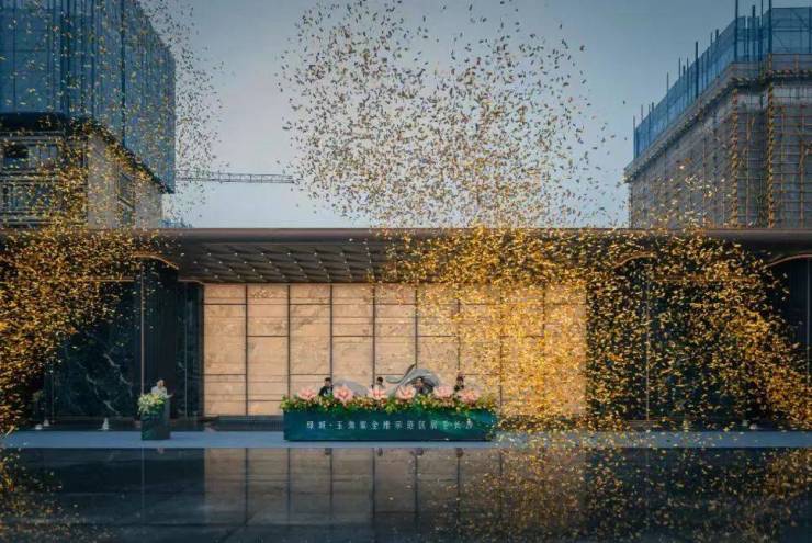 金属铝板门头吊顶、巨幅奢石景墙、如海棠花瓣飘落大师砚台之上的优雅雕塑……充斥着礼序与仪式感的归家入口着实璀璨夺目。