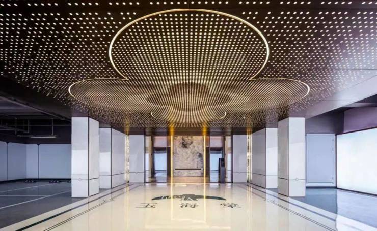 地库的呈现给人满满的精致感,不仅仅是环氧地坪+星空顶地下光厅+车道吊顶的高级配置,还有贯穿全局的“玉海棠”式符号。
