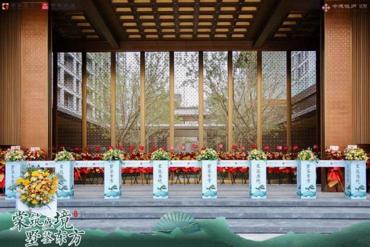宽32米、高7.5米的礼序门庭,以海棠纹印鎏金铺陈,取法古籍装帧意境,如徐徐展开的竹简,将书院雅韵融于当代规制,巍然矗立间诠释何为世家气度的视觉凝练。这方围合之境,既是对宾朋的东方仪典,更化作城市喧嚣的滤境,自成当代人文画境。