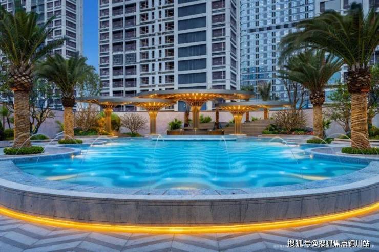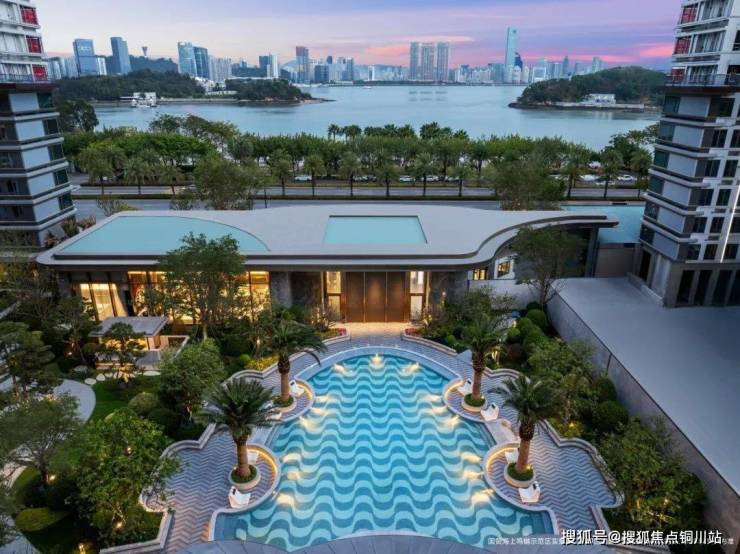 海上鸣樾中庭园林采用古典园林中轴对称布局,中央水景选用定制级玻璃马赛克,融汇金色斑纹,高质感的流光水境让海洋生活美学生动立体、跃然其上。 “海上繁花”廊架作为中轴线的视觉焦点,采用雕塑形制,呈现自然曲线美与生命力,96根圆形线条向上生长,开枝散叶,呼应“绿野森屿”的诗意与蓬勃;夜幕里270盏灯光亮起,则幻若星河,与流动的水景一起,匠造森屿和鸣的生活空间。海上鸣樾以迭新产品呈现,书写美好生活场域。