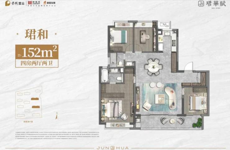:152㎡、156㎡、190㎡、222㎡(均为四房以上设计,主卧套房化)