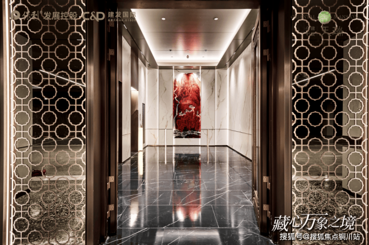 在美学设计上,取意李可染"万山红遍"的恢弘意境,以整块玻璃珐琅打造“盛世红颜”景墙,与地上入户大堂相呼应