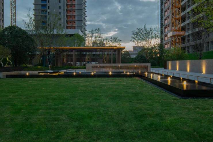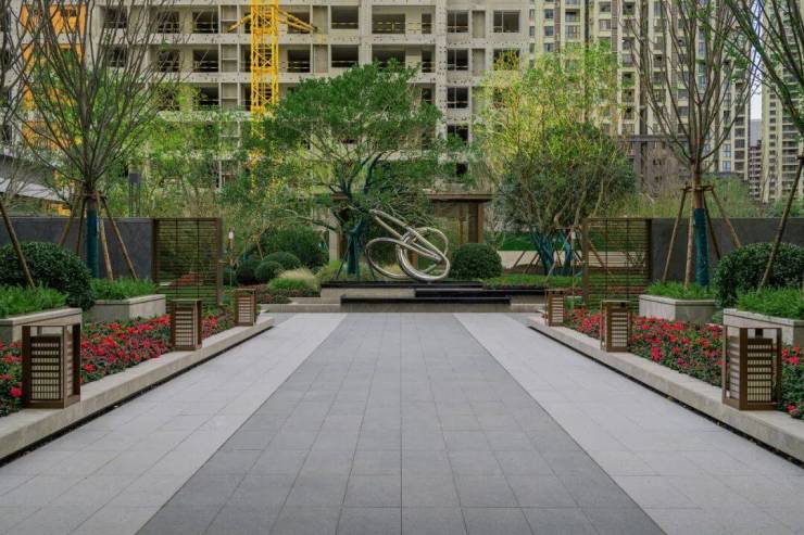 穿过前场水景、迎宾大堂,大区整体铺装以芝麻荔枝面仿石砖为主,长远景深由精致的雕塑水景收住视野。