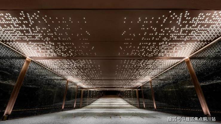 星空顶在车行途中洒下银河般的光辉,爱马仕黑石材构筑的玄关对景墙气势恢宏,水磨石地面镶嵌的金属归家标识指引方向,车马厅顶面的铝板铺装反射出高级灰的质感。
