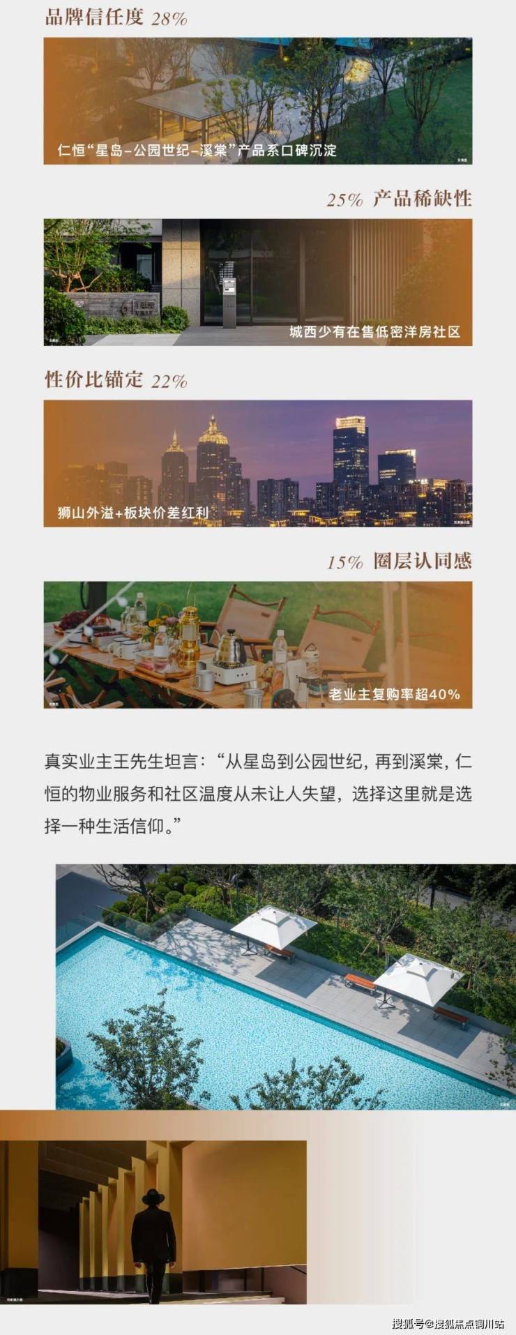 城西难得的洋房社区规划,让仁恒溪棠在一众高层产品中脱颖而出。 新加坡造园手法、超万方的中央园境、一轴八园景观规划,创造城市难得的诗意栖居; 约400㎡儿童戏水池、约500m康养漫步道、星空露台等公区为社区赋予更多功能性。在仁恒溪棠,每一位居者都能够找到自己的舒适区。