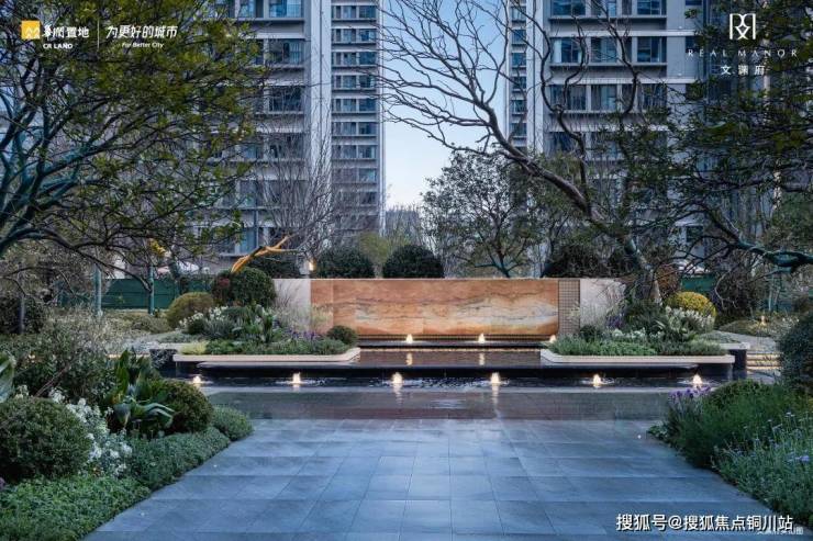 穿过酒店式社区大堂就来到了中央景观中轴,这里有大片的绿植、涌泉,还布置了石材景墙,气势宏大。每一处绿植景观层次都很丰富,我粗略数了下,至少四五层,这是非常难得的,而且选用的树种高大挺拔、冠幅粗大,相信待这些树木吐露新芽,花树相衬,一定美得不像话!