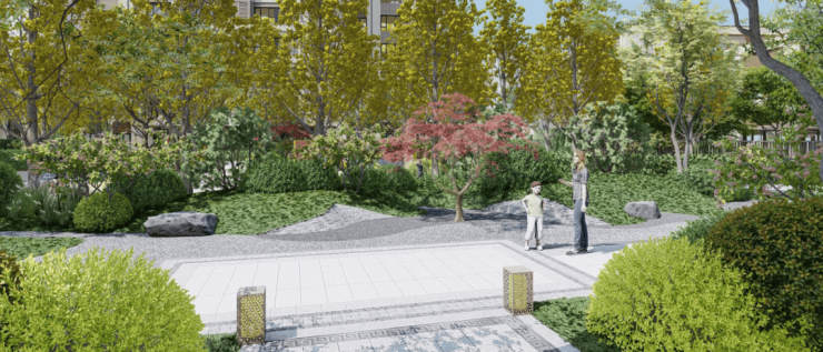 在草坪的周边,有适合仲夏夜和家人一起观星、纳凉的“台望”,有老人们喜欢的康养健身区,累了还能在绿树成荫的禅意花园冥想放松……