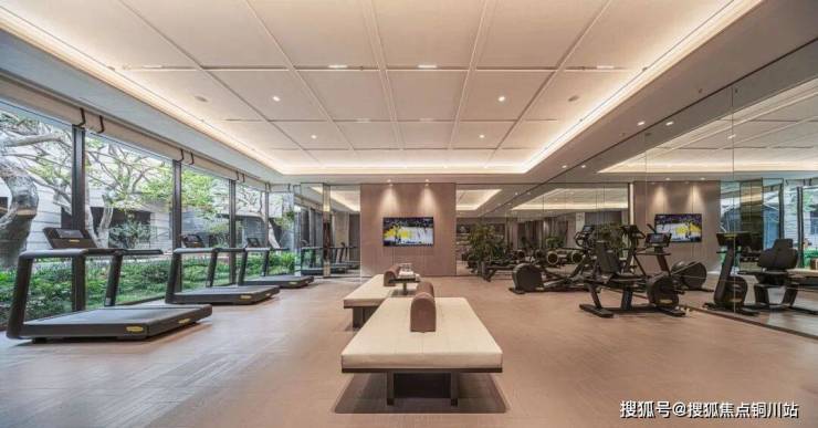 健身房分有氧区、力量区,动静分离,品牌也都是泰诺健,健身房直面下沉式庭院景观,健身时心情都更舒畅了几分