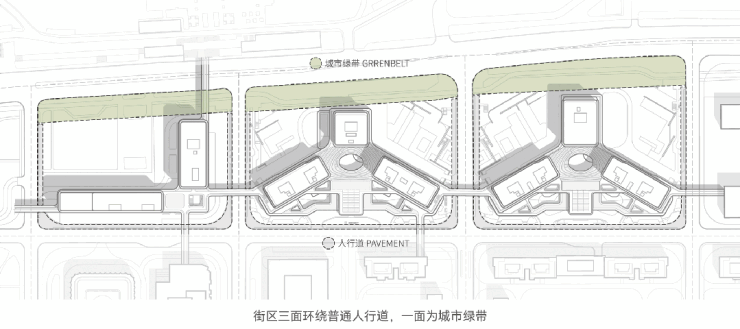 基于竞赛方案“城市聚场”提出的便捷可达、尺度宜人、业态多元、场所开放的理想原型,“异构街坊”方案深化依然是从城市、街区、空间三个尺度关系着手,从布局调整到尺度协调,从空间策略到复合体验,从完全开放到多层级开放,最大限度融入环境并激发新活力。