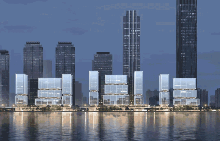 建筑整体延续了竞赛阶段提出的群像式“长江画屏”概念,单体也保持垂直方向的体量三段划分关系。8座板式塔楼采用体块分段和前后推拉的形式,形成退台,拓展室外露台空间,优化横向尺度,强化建筑与江面在形态上的呼应,塑造灵动而富有韵律的天际线形象。