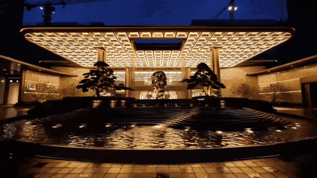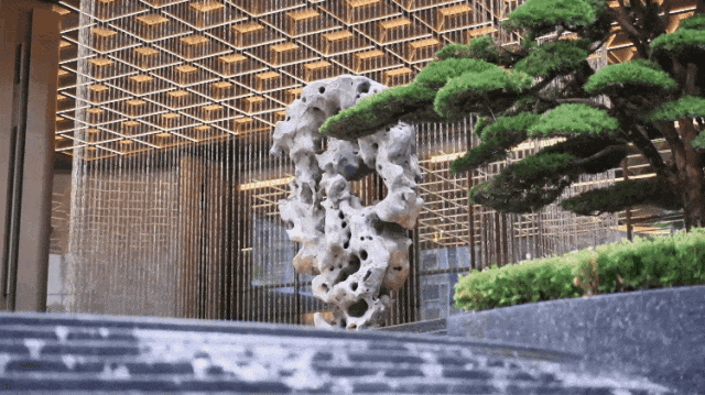 整座大门的视觉中心是团队历时1年、大师数十轮遴选所得约三万顷太湖碧波深处、历经千百年水脉滋养的太湖石。周边以元宝金帘、叠水相衬,取"水润金石生财,气贯门庭兴旺"之意。