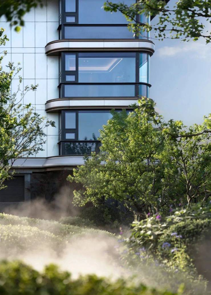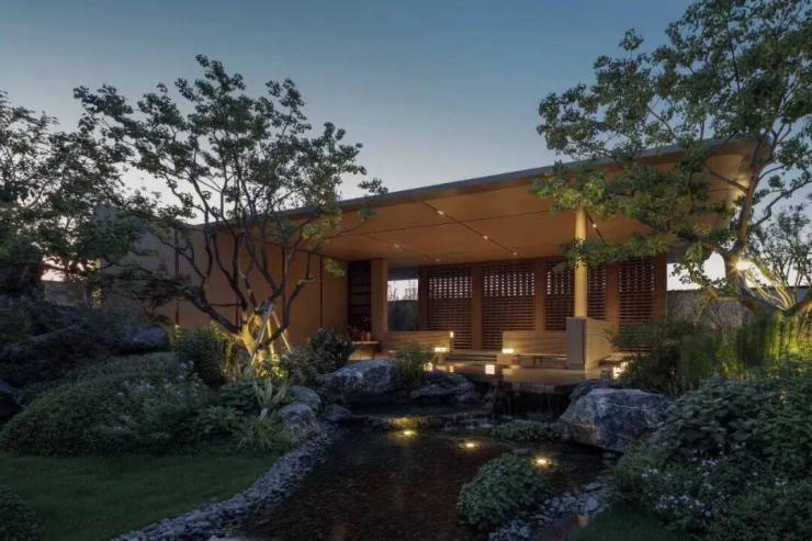 下沉式会所内的园林景观仅是小区景观极小的一部分,整个小区景观规制提炼无锡当代艺术家吴冠中的十二幅名画,以烟波、飞泉等十二种自然元素渗透场地,呈现画意场景,勾勒江南生活。